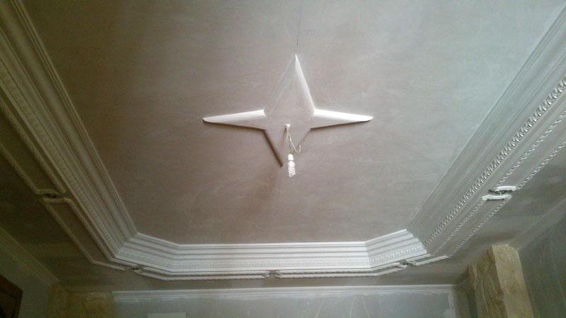 En estas fotos podemos ver dos techos de escayola con unas molduras por las orillas y unos junquillos por la parte de dentro del techo y su pieza decorativa en la esquina. |